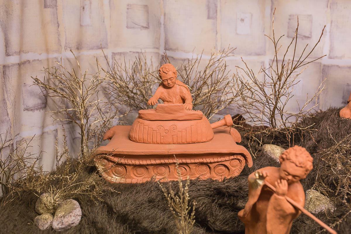 The rocket SS and Pershing-2 become, in the dream of the angels, a bench for the mother and a cradle for the divine child. The rifles become flutes and children's toys. The tanks change into organs on which one can play Bach's fugues. The cannons become violoncellos on which one plays pieces of music. The patron belts, in the dream of the angels, become panpipes and the grenades become oboes whose romantic melodies go to the heart. The rockets morph into harps that play love songs." The nativity scene actually dates back to the Cold War, but when you consider the countless warlike conflicts that take place today and the billions of euros spent on weapons, it has lost none of its topicality.